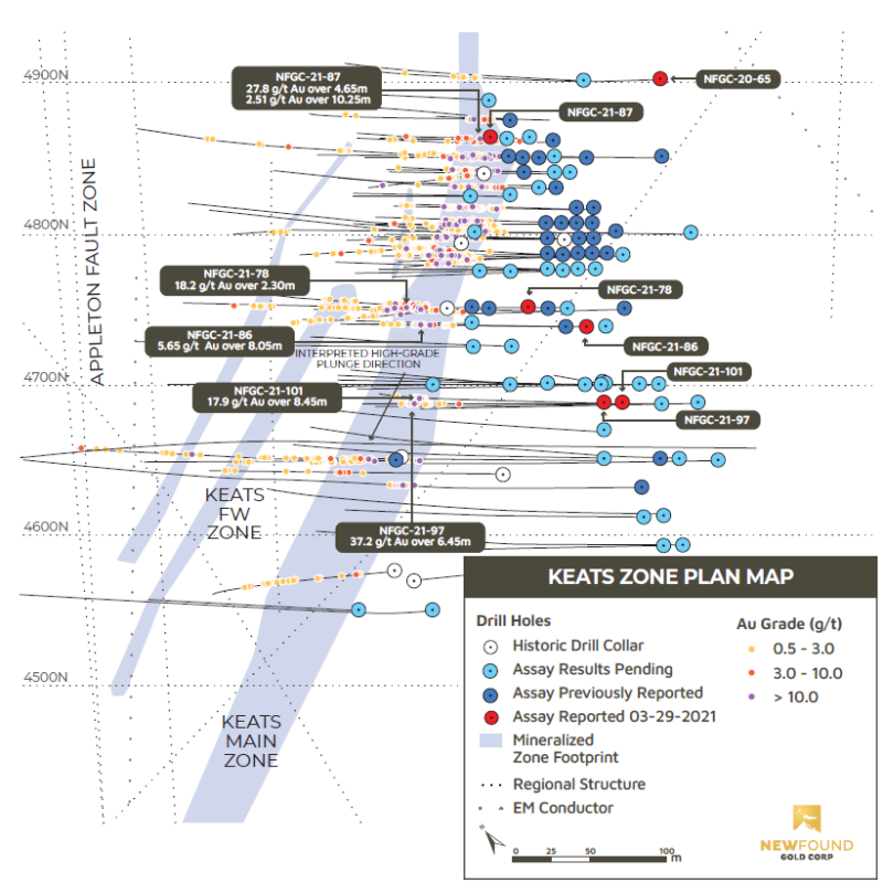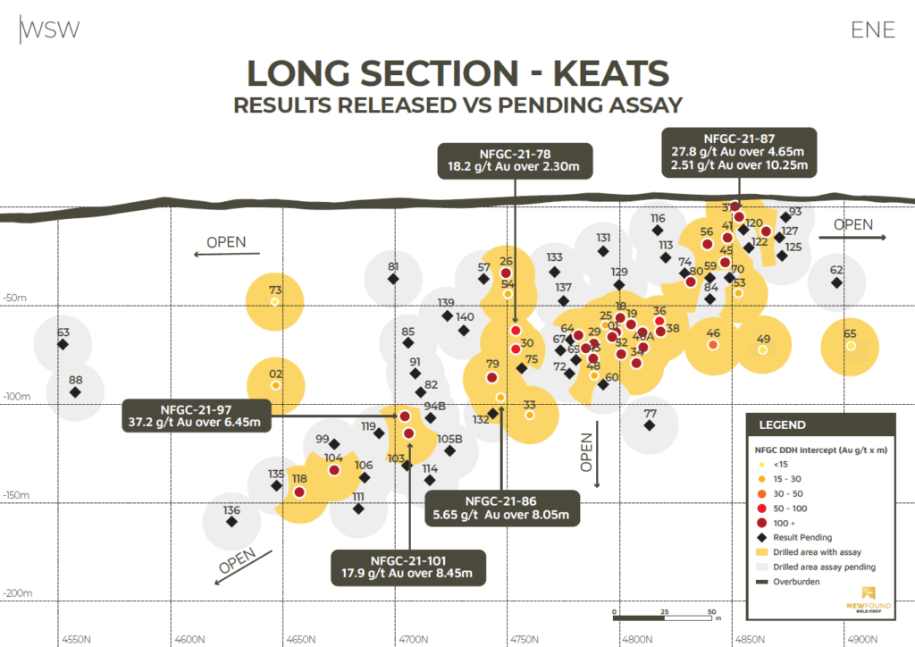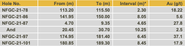 - The intervals of 37.2 g/t Au over 6.45m and 17.9 g/t Au over 8.45m in drill holes NFGC-21-97 and NFGC 21-101 provide further confirmation of the continuity of the Keats high grade zone in the down-plunge direction (Figure 1).