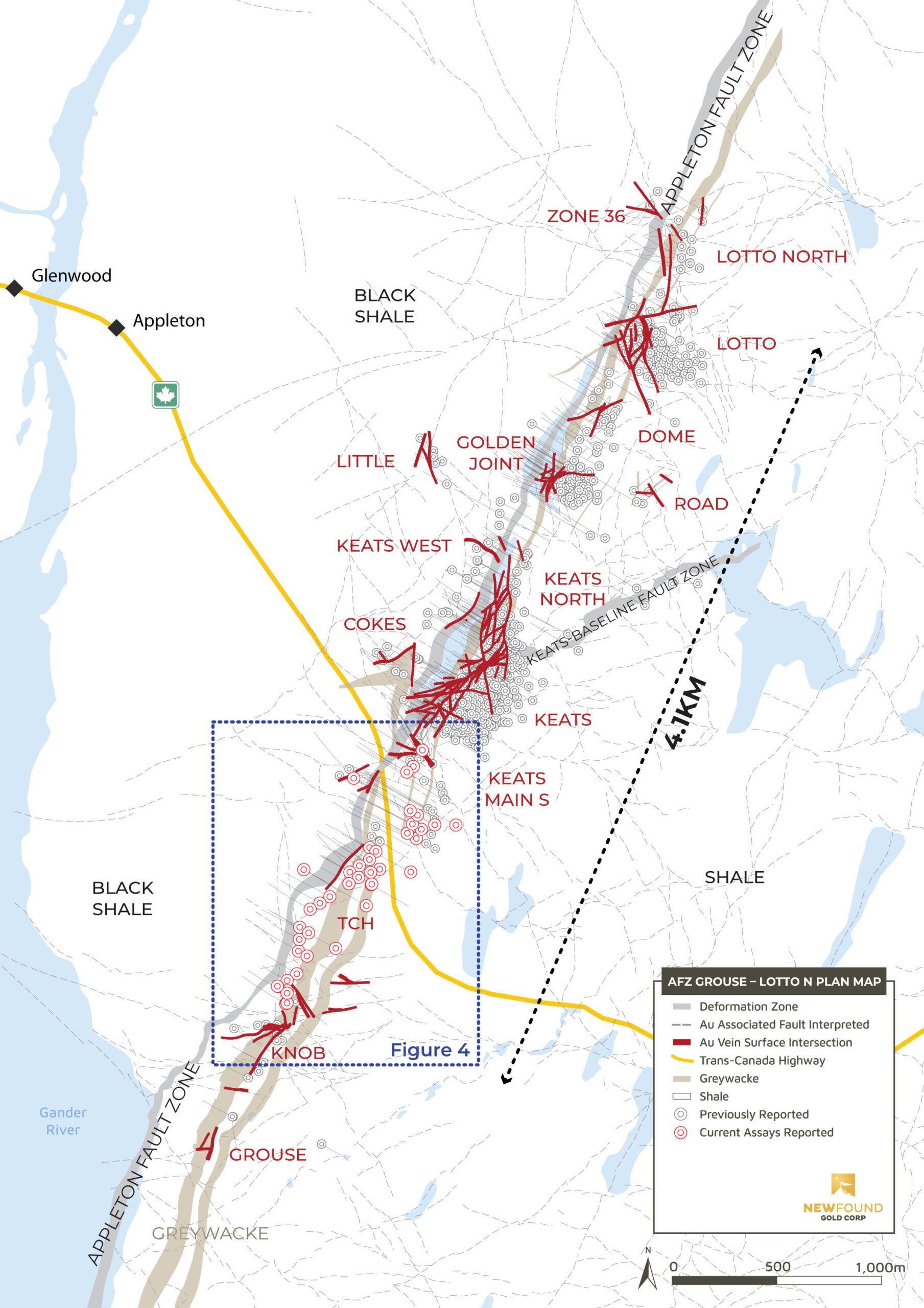 - Systematic and targeted drilling along the highly prospective AFZ corridor has continued to delineate high-grade gold mineralization now extending 1.5km south of Keats, including the discovery of the new TCH Zone, and new veins and structures around existing zones. Importantly, the high-grade corridor of gold along the AFZ has now been tracked over 4.1km from Lotto North/Zone 36 down to Knob, with much of this area remaining underexplored (Figure 1).