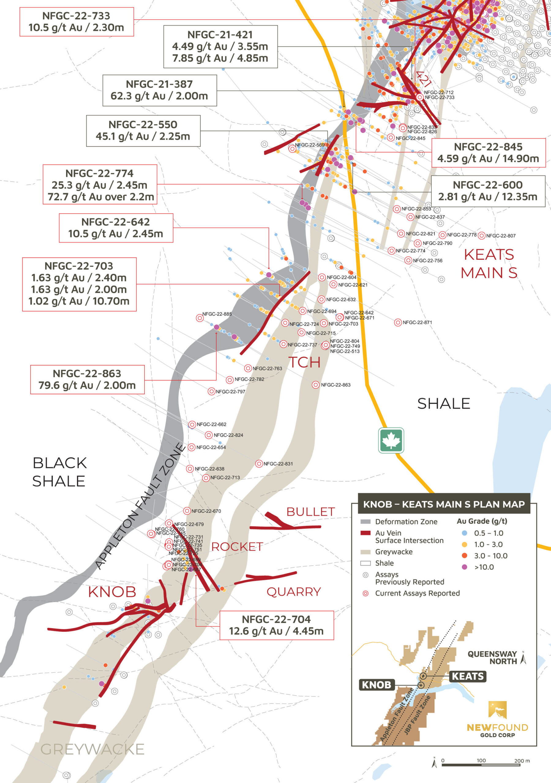 Vancouver, BC, January 18, 2023 – New Found Gold Corp. (“New Found” or the “Company”) (TSX-V: NFG, NYSE-A: NFGC) is pleased to announce the results from 51 diamond drill holes that were completed as part of an ongoing systematic and targeted drill program exploring the highly prospective segment of the Appleton Fault Zone (“AFZ”) from the south end of the Keats Main Zone to the Knob Zone. New Found’s 100% owned Queensway project comprises an approximately 1,650km2 area, accessible via the Trans-Canada Highway approximately 15km west of Gander, Newfoundland and Labrador.