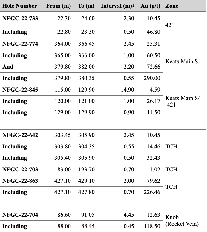 - At the southern extension of the Keats Main Zone (Keats Main South) the Company continues to intersect high-grade gold mineralization following up on its October 18, 2022, release. Highlight intercepts include 25.31 g/t Au over 2.45m and 72.7 g/t Au over 2.20m in NFGC-22-774 and 4.59 g/t Au over 14.90m in NFGC-22-845. The high-grade gold associated with the Keats-Baseline Fault Zone, the structure that hosts the Keats Main Zone, has now been traced over a strike length of 1.1km and down to a vertical depth of 400m (Figures 1- 4).