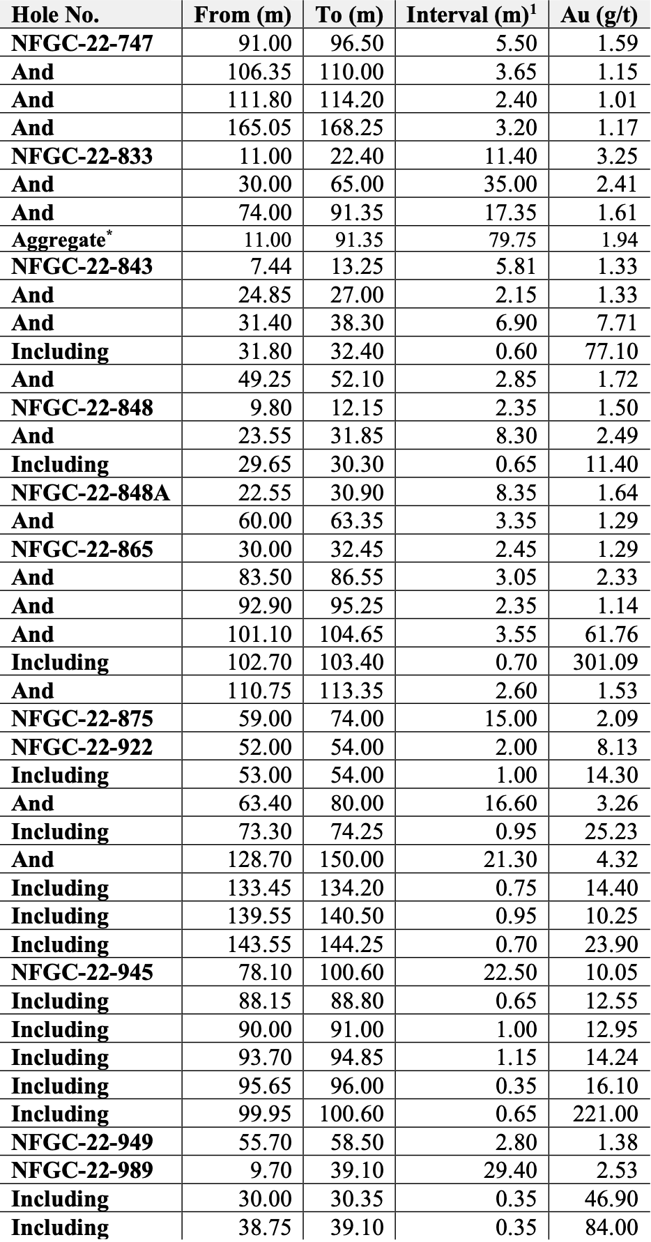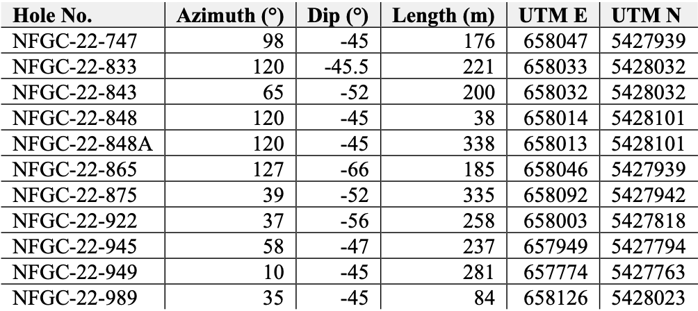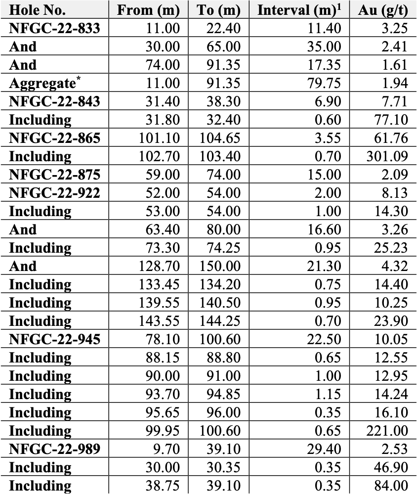 • Additional notable intercepts released today within the Keats West zone include 61.8 g/t Au over 3.55m in NFGC-22-865, 3.26 g/t Au over 16.60m, and 4.32 g/t Au over 21.30m in NFGC-22-922, and 2.53 g/t Au over 29.40m in NFGC-22-989.