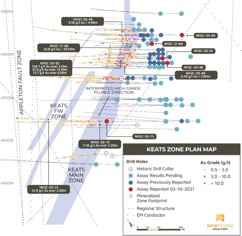 - Importantly multiple intervals of high-grade gold mineralization were also intercepted within the Keats Footwall veins which lie between the Keats Baseline Fault and the Appleton Fault Zone. NFGC-20-73 encountered a footwall vein at 191.5m down hole that returned 21.9g/t Au over 2.50m including a 0.65m interval displaying visible gold that assayed 83.4 g/t Au. NFGC 20-49 encountered a footwall vein at 178m down hole that returned 5.55 g/t Au over 4.95m including an interval displaying visible gold that assayed 21.2g/t Au over 1.0m.