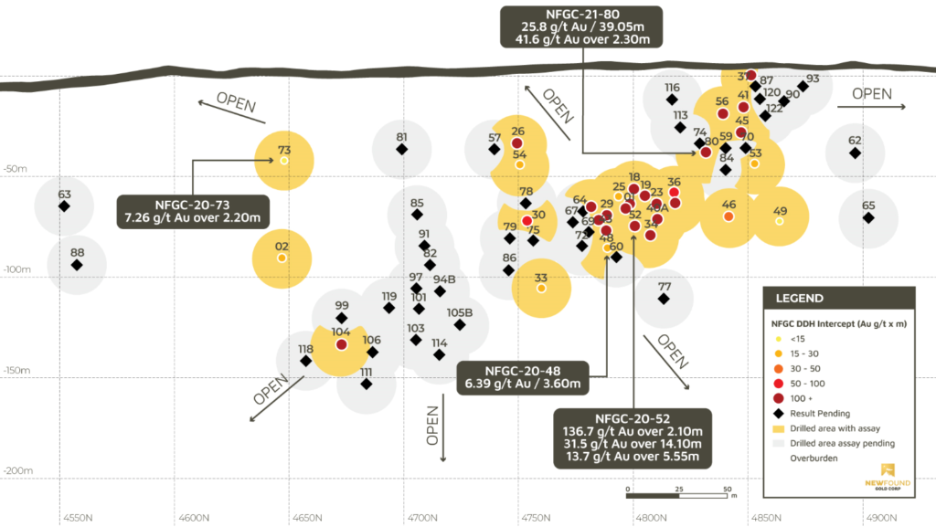 Greg Matheson, Chief Operating Officer of New Found, stated: “Holes 52 and 80 provide further confirmation of the impressive widths of high-grade, near surface gold mineralization in the Keats Baseline Fault. Drilling is now focused on stepping out to the north, south and to depth. Drilling to date at Keats has also encountered multiple veins in the footwall of the Keats Baseline Fault, typically returning assays in the 0.5 to +3.0g/t range. The high-grade intervals recently encountered in this secondary veining is very encouraging. The initial high-grade discovery hole (92.9g/t over 19m in NFGC-19-01) in the Keats Baseline Fault was drilled below veining that returned multi-gram assays and that occurred within much longer intervals (up to +100m) of halo gold mineralization. In addition to the high-grade assays reported, Hole NFGC-20-73 returned a cumulative 125m that assayed above 0.1 g/t, indicating a broad anomalous gold halo within the Keats Baseline footwall. We will continue to step-out on these intervals to test for additional zones of high-grade gold mineralization between the Keats Baseline fault and the Appleton Fault.”
