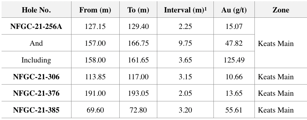 - The interval of 47.82 g/t Au over 9.75m in NFGC-21-256A provides further definition of a south-plunging zone of significant thickening of high-grade gold mineralization within the Keats-Baseline Fault interpreted to be hosted in a zone of dilation (Figures 1 and 2).