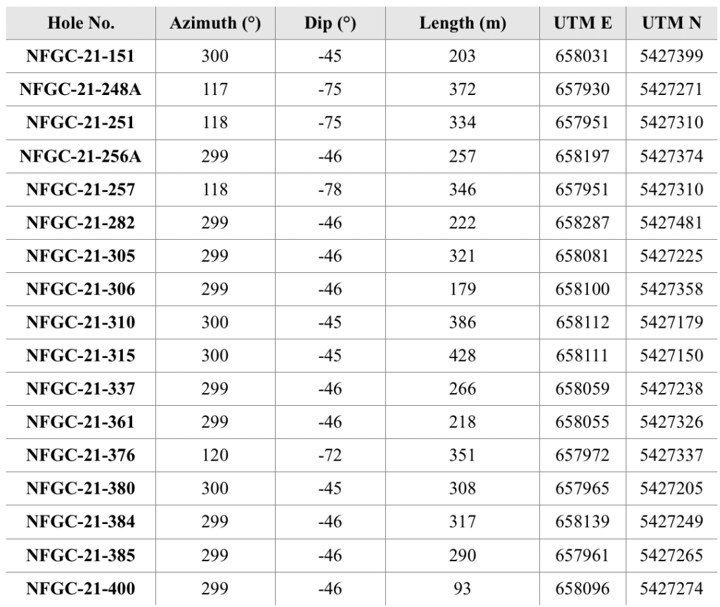 - Similarly, the intercept of 10.66 g/t Au over 3.15m in NFGC-21-306 is approximately 75m up-dip of intervals interpreted to be in the dilation zone including NFGC-21-104 which returned 29.10 g/t Au over 11.4m (previously reported, see March 1, 2021, news release).