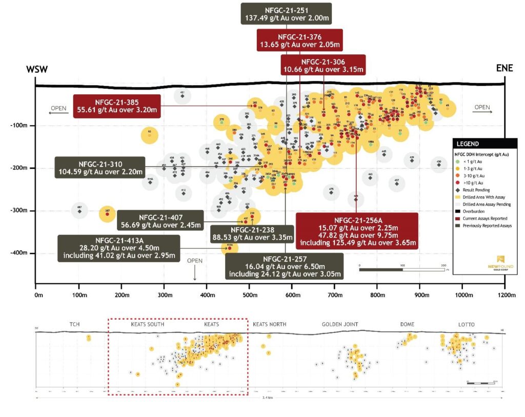 Greg Matheson P.Geo., Chief Operating Officer for New Found, stated: “These impressive high-grade drill intervals at Keats continue to extend and add definition to the Keats discovery. The intercept of high-grade near surface (45m depth) gold mineralization at a location over 400m south-west from where the thickened dilation zone of high-grade gold is projected to reach surface further demonstrates the broader extent of high-grade gold mineralization hosted within the Keats-Baseline Fault. At Keats, high-grade gold mineralization has now been intercepted in drilling over approximately 800m of strike and from surface to nearly 400m of vertical depth. The three drills operating at Keats continue to step out in all directions. As an orogenic gold system there is good potential to extend this system to multiples of the depth tested so far, and our ongoing drilling will continue to chase this high-grade zone to depth.”