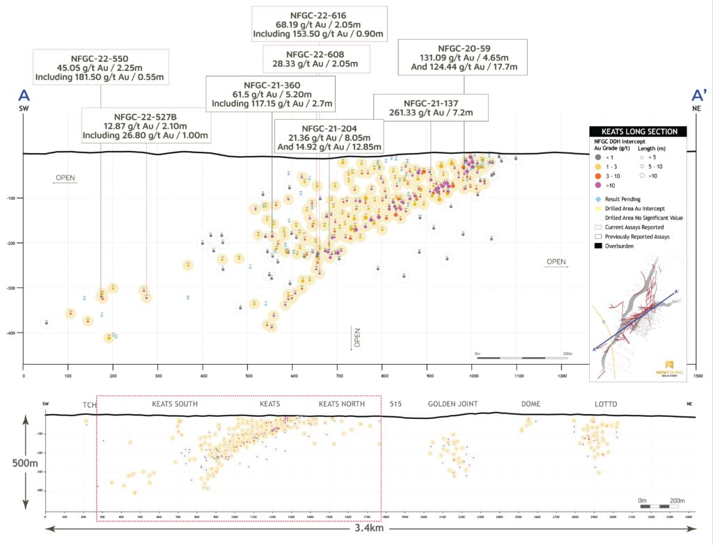 - The overall Keats area now spans a strike length of approximately 1.6km and is comprised of several high-grade gold discoveries including those made at Keats Main, Keats North, and most recently, Keats West (reported on September 27, 2022).