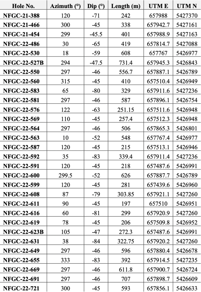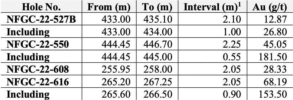 - Continued exploration drilling in the central portions of the Keats Main Zone targeting the Equinox Vein, a key component of the high-grade gold domain that plunges to the southwest within a segment of the KBFZ has intersected gold-rich portions of the vein, highlights of which include 28.33 g/t Au over 2.05m in NFGC-22-608 and 68.19 g/t Au over 2.05m in NFGC-22-616(Figures 1, 2, 3 and 4). The Equinox Vein to date has been traced over a strike length of 720m and 120m down-dip.