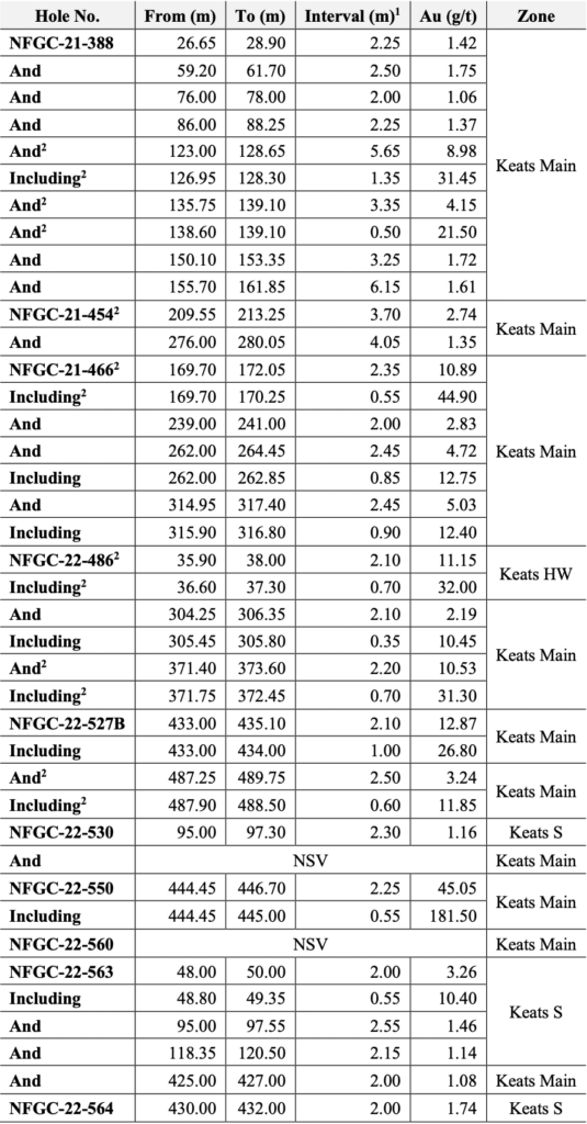 - Exploration along the southern extents of Keats Main, which is defined by gold mineralization hosted within the extensive damage zone associated with the Keats-Baseline Fault Zone (“KBFZ”), has extended the strike length of Keats Main Zone to 1km with high-grade intervals of 12.87 g/t Au over 2.10m in NFGC-22-527B and 45.05 g/t Au over 2.25m in NFGC-22-550 (Figures 1, 2, 3 and 5).
