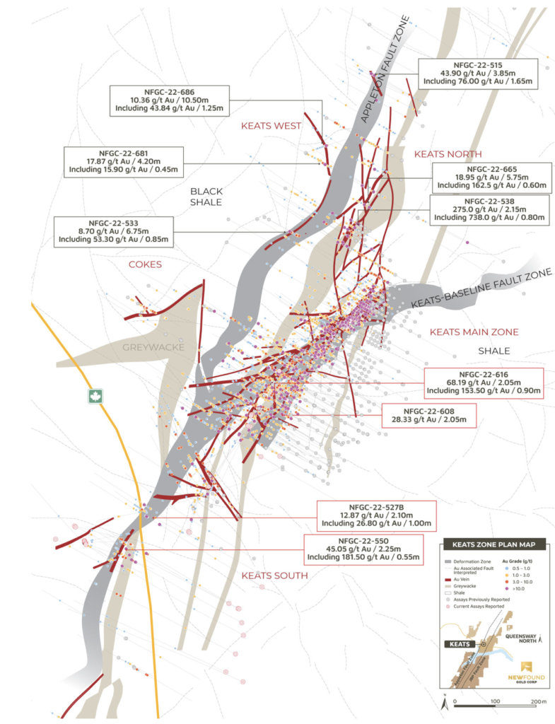 Vancouver, BC, October 18, 2022 – New Found Gold Corp. (“New Found” or the “Company”) (TSX-V: NFG, NYSE-A: NFGC) is pleased to announce the results from 30 diamond drill holes that were completed as part of a program designed to test the down-plunge extents of the Keats Main Zone located along the highly prospective Appleton Fault Zone (“AFZ”). New Found’s 100%-owned Queensway project comprises a 1500km2 area, accessible via the Trans-Canada Highway, 15km west of Gander, Newfoundland and Labrador.