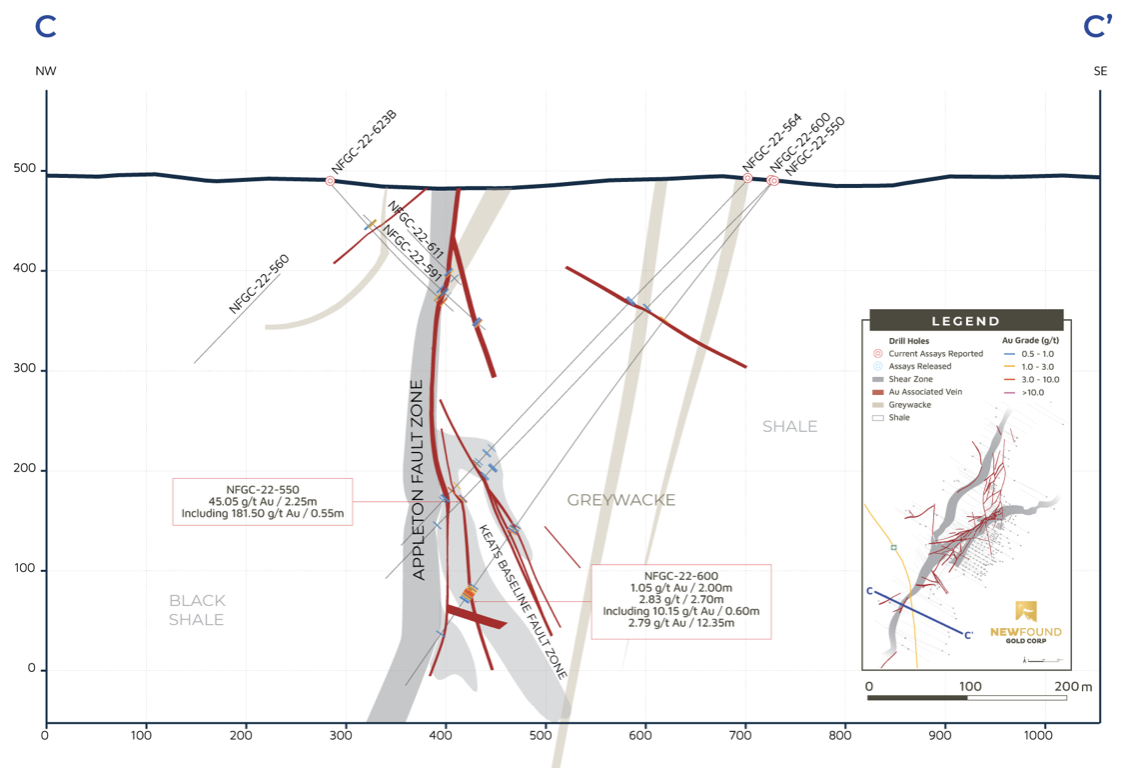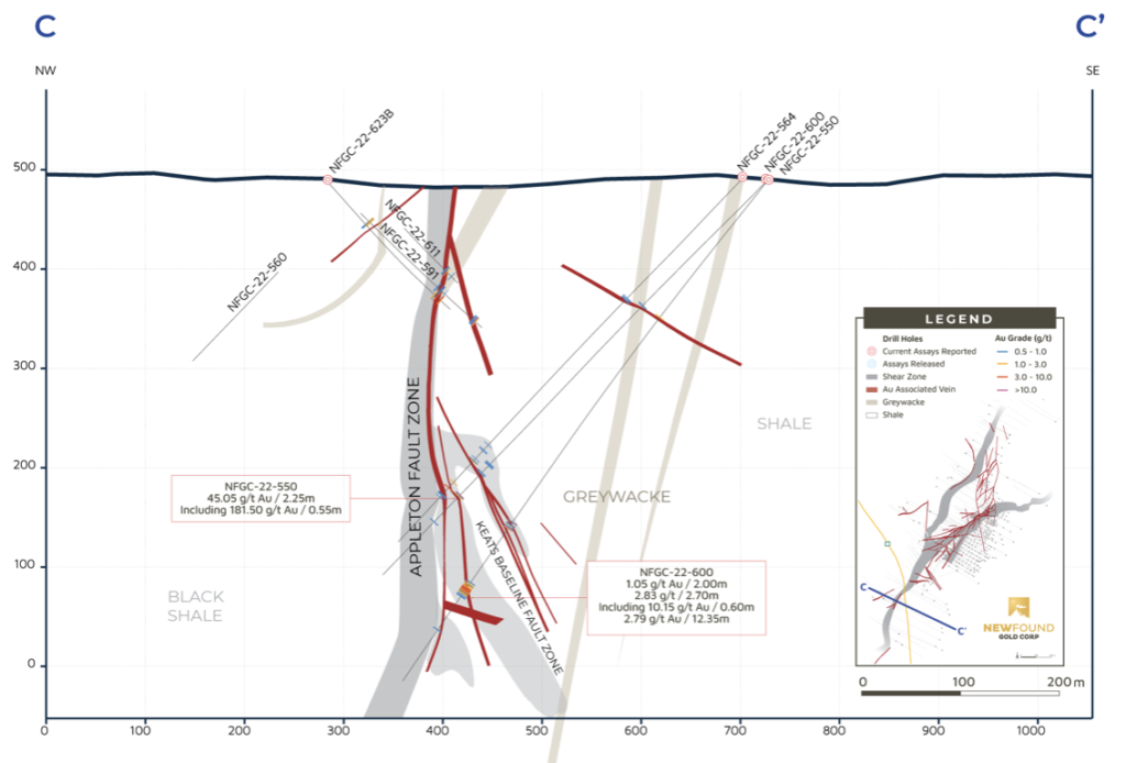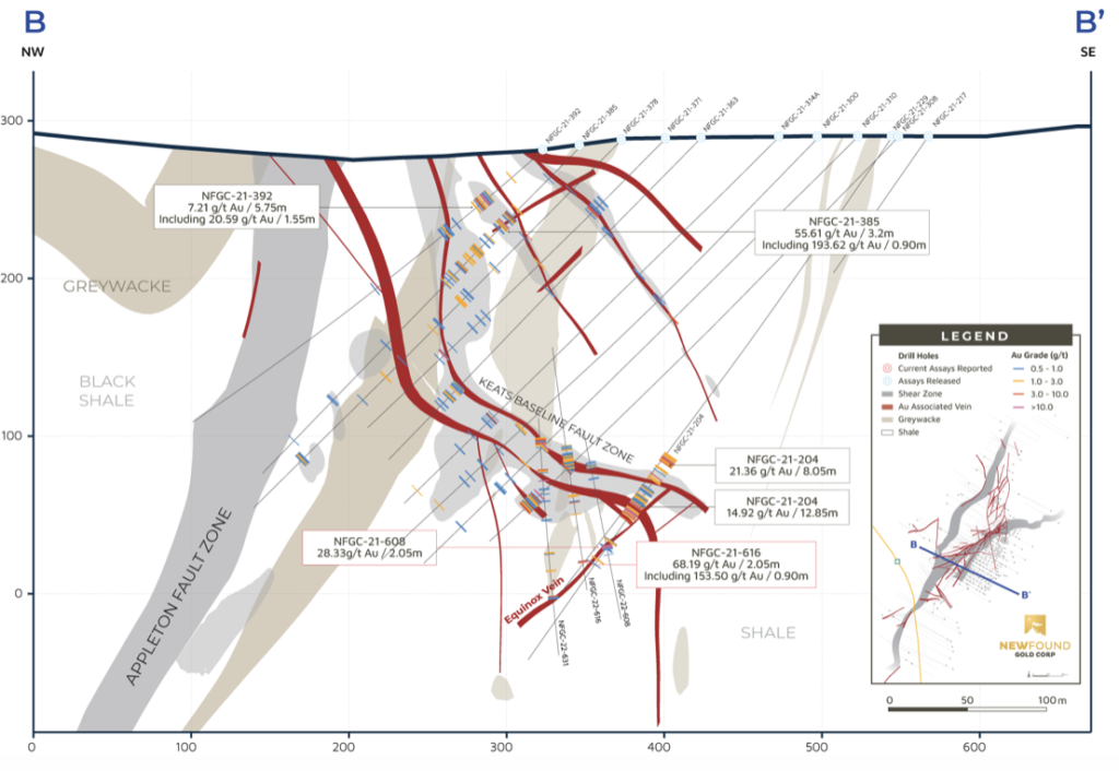 Melissa Render, VP Exploration for New Found stated: “The Keats-Baseline Fault Zone is comprised of an extensive brittle damage zone adjacent to the Appleton Fault Zone that hosts a network of high-grade gold veins. Today’s results demonstrate that this gold-bearing fault persists over a strike length of at least 1km and likely to depths beyond our current drill footprint. The AFZ is the primary gold-bearing fluid conduit, and the KBFZ is the structural trap where gold has precipitated. Drilling aimed at expanding the Keats Main Zone to the south, which is hosted within the KBFZ, has identified mineralization akin to the characteristic epizonal mineralization styles found elsewhere within the KBFZ and with high gold grades to match. Orogenic gold systems are known to have deep roots, occur in areas of structural complexity, and demonstrate structural repetition. This is fundamental to the design of our exploration drill program targeting the deeper extents of the KBFZ but also where it interacts with the AFZ. Today’s results give us great encouragement in this region of the KBFZ and we are eager to continue to explore and expand on this discovery.”