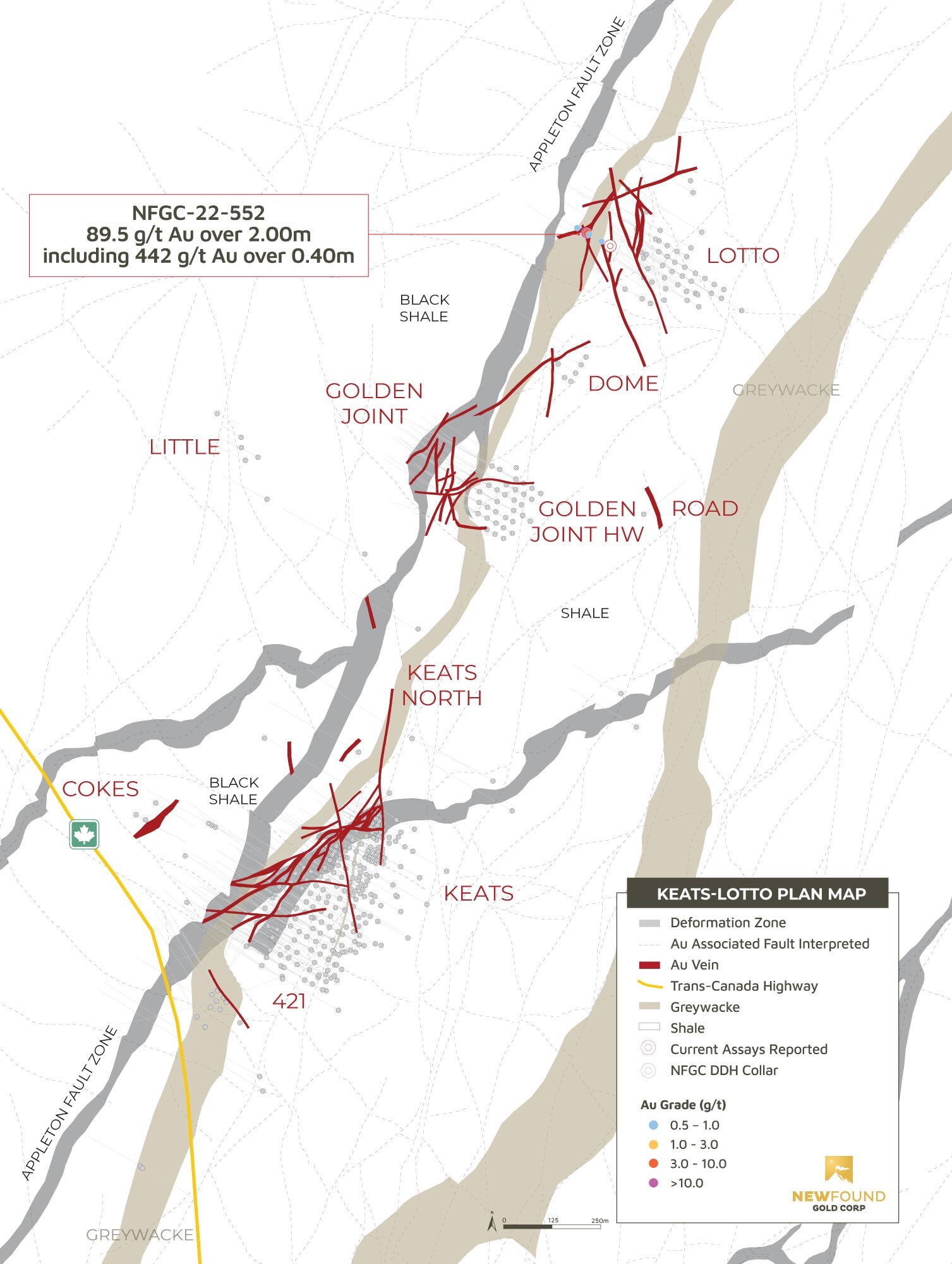 Melissa Render, VP Exploration for New Found, stated, “The ongoing systematic drill-testing along this well-mineralized Keats – Lotto segment of the AFZ continues to identify very gold-rich epizonal-style vein networks. Gold-bearing structures propagate in differing orientations throughout a +200m wide corridor of rock adjacent to the AFZ. The extent of this fracture zone is not well constrained by drilling to date, but many lengths of untested structure are interpreted in the volume defined so far, and these are currently being targeted by drilling, particularly focused on near-surface gold mineralization. The Lotto Main vein located further east remains an important open-ended high-grade gold target with drills currently working to define its extent along strike to the north.”