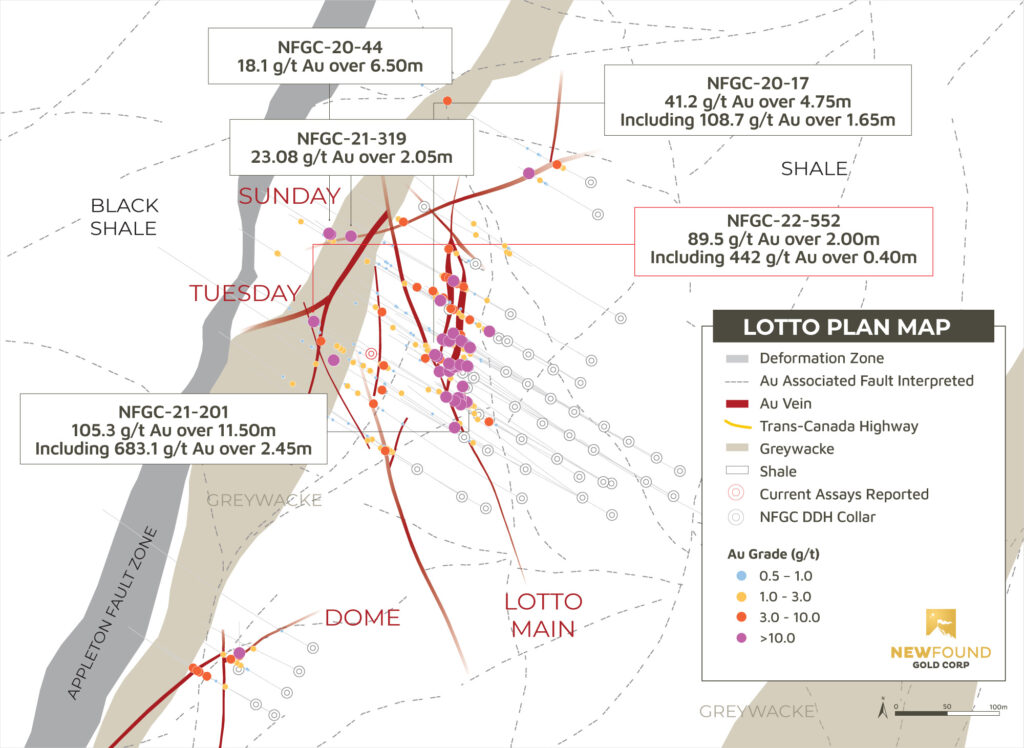 Vancouver, BC, June 8, 2022 – New Found Gold Corp. (“New Found” or the “Company”) (TSX-V: NFG, NYSE-A: NFGC) is pleased to announce a new high-grade gold discovery located at the Lotto prospect. This hole was drilled as part of an ongoing systematic grid drilling program to test along the highly prospective regional-scale Appleton Fault Zone (“AFZ”). New Found’s 100% owned Queensway project comprises a ~ 1500km2 area, accessible via the Trans-Canada Highway approximately 15km west of Gander, Newfoundland.
