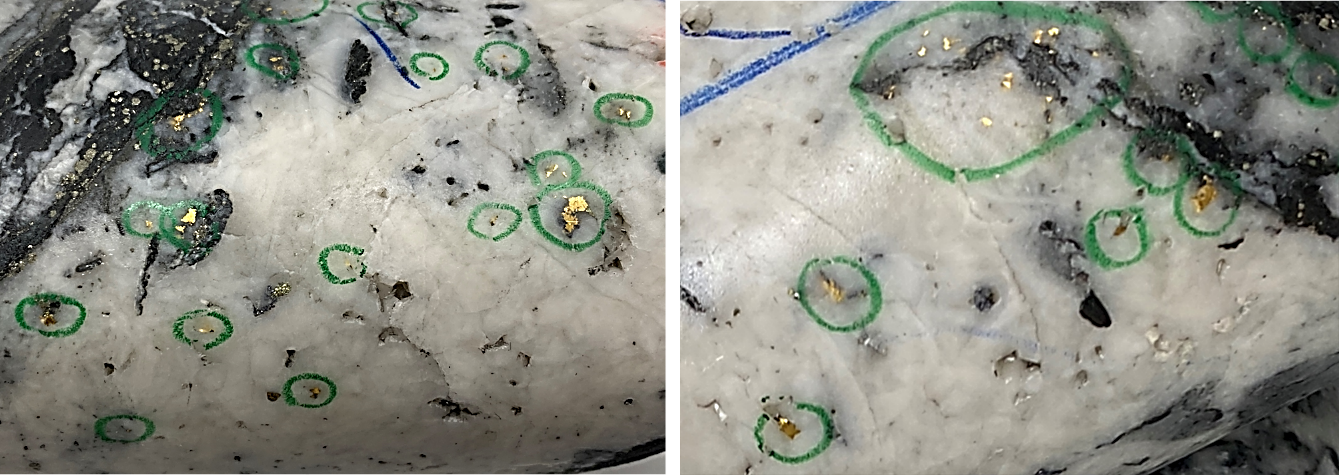 Samples that have VG identified or fall within a mineralized interval are automatically submitted for screened metallic assay for gold.