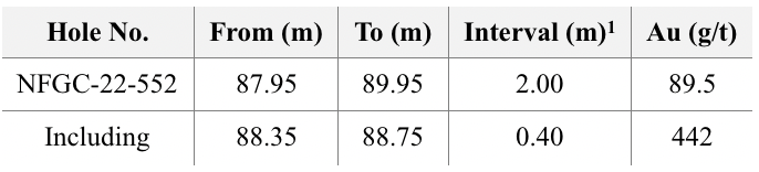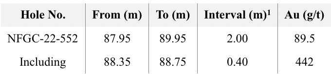 - At the Lotto prospect, drill testing in the area between the “Lotto Main” vein and the AFZ, intersected a new high-grade zone that returned 89.5 g/t Au over 2.00m in NFGC-22-552 that is 55m below surface, named the “Tuesday” Zone (Figures 2 and 3).