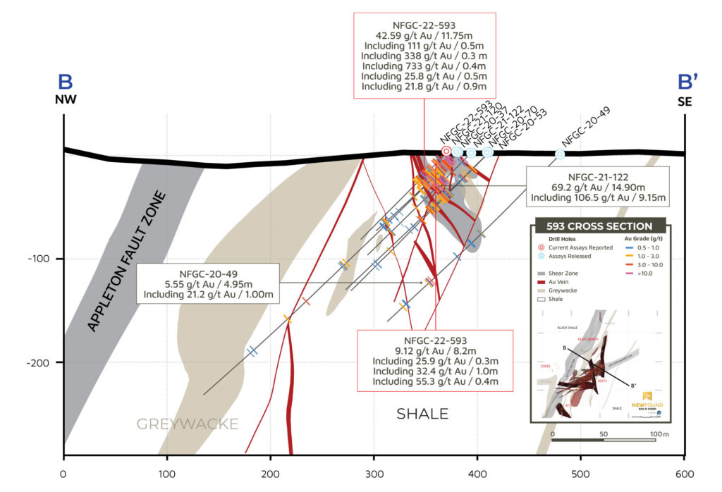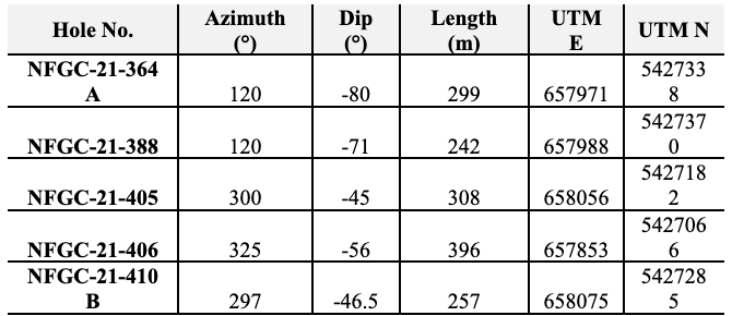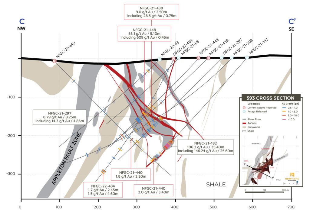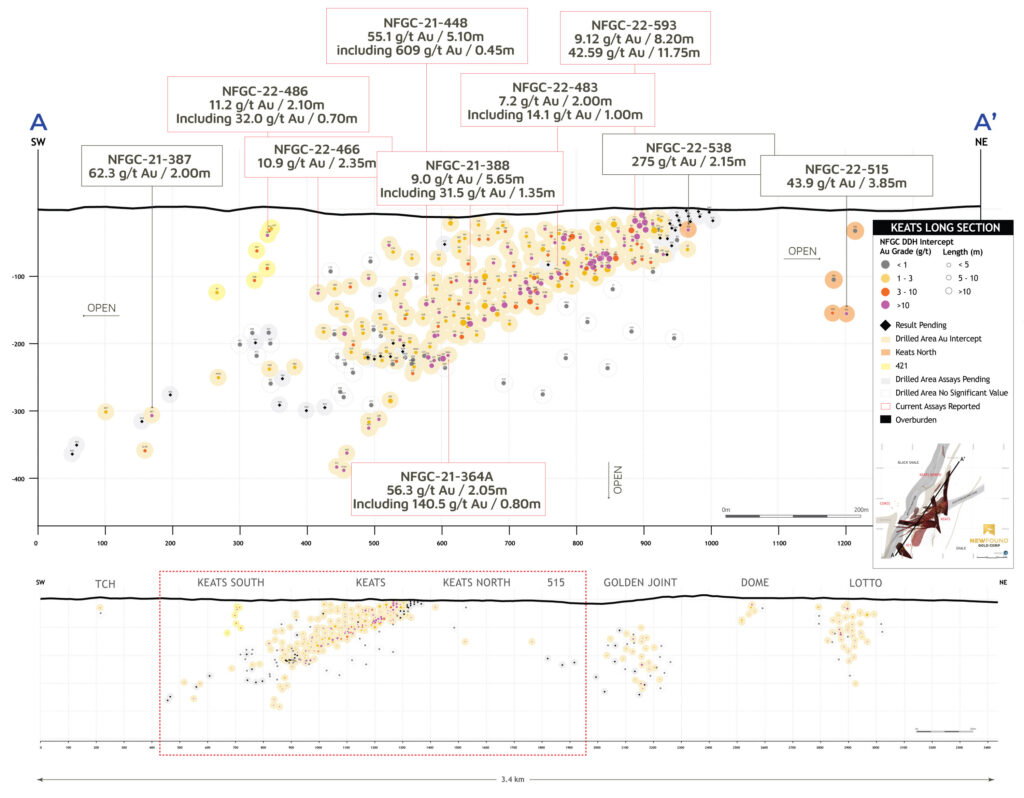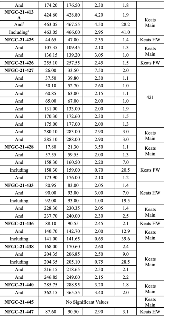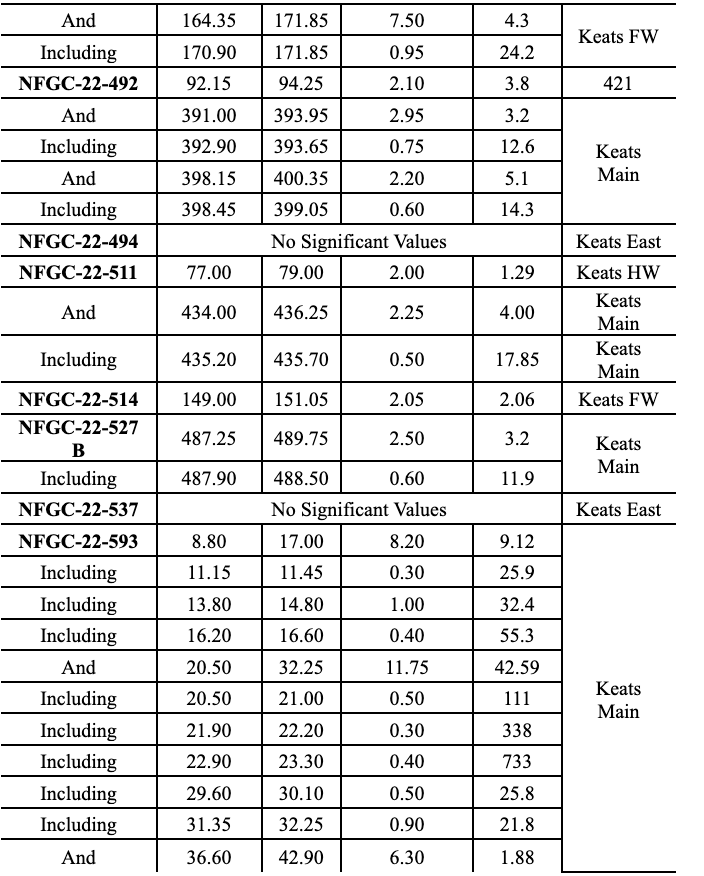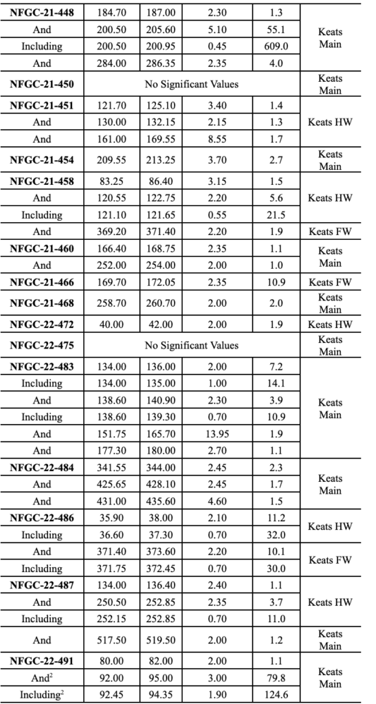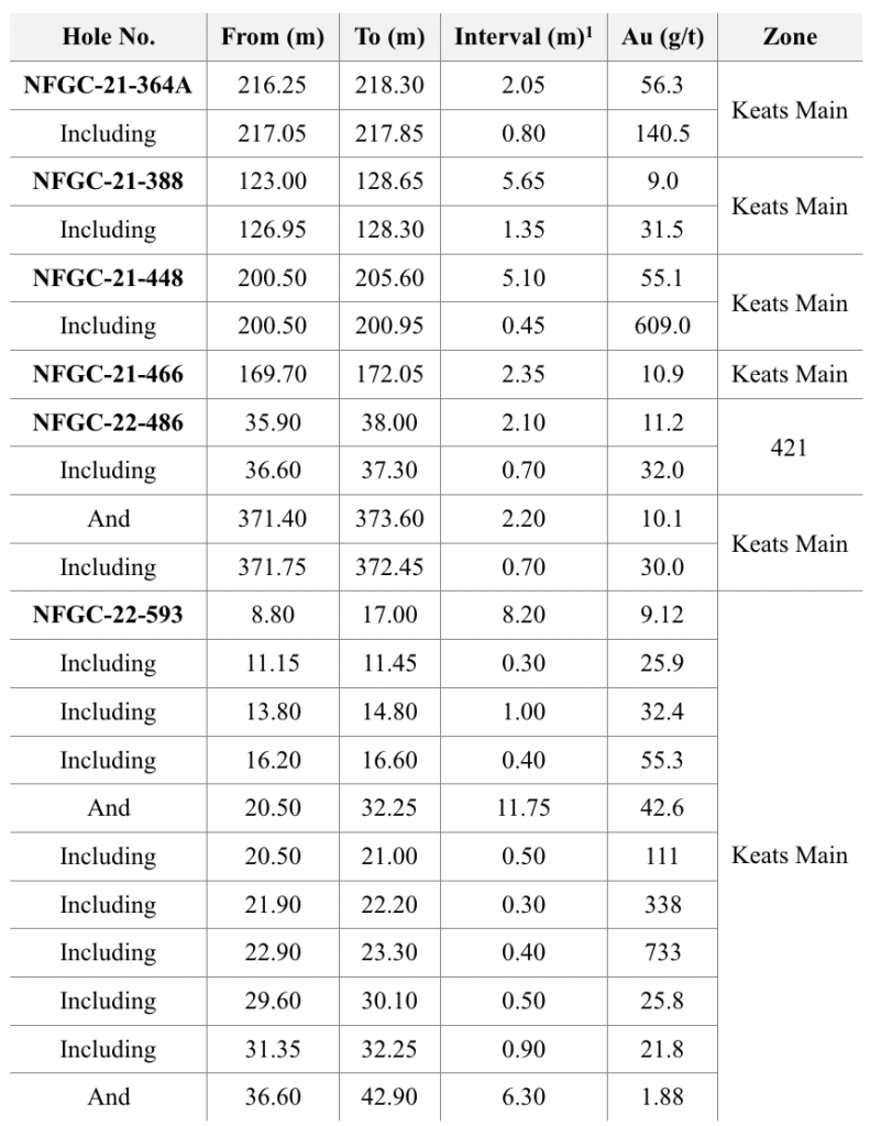 - 55.1 g/t Au over 5.10m in NFGC-21-448, 56.3 g/t Au over 2.05m in NFGC-21-364A, 9.0 g/t Au over 5.65m in NFGC-21-388, 10.9 g/t Au over 2.35m in NFGC-21-466 and 10.1 g/t Au over 2.20 in NFGC-22-486 are all intersections in the Keats Main Zone which to date has been defined over 845m down plunge and intersected at a vertical depth of 375m. The Keats Main Zone consists of a network of veins that is associated with the KBFZ which generally strikes N55°E and dips ~60° to the southeast (Figures 2, 3 and 5).