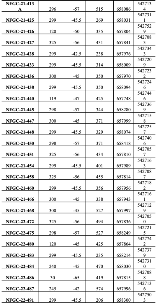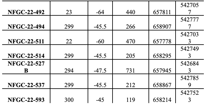 - Targeting the 421 Zone at the south end of Keats, NFGC-22-486 intersected 11.2 g/t over 2.10m at ~30m below surface. This high-grade gold mineralization is associated with an extensive moderately southwest dipping brittle fault zone that appears to play a role in localizing gold. The extents of this target area are not well constrained and this fault zone area and its projected intersections with the AFZ and KBFZ are high priorities for the current drilling (Figures 2 and 3).