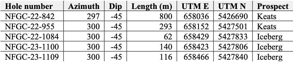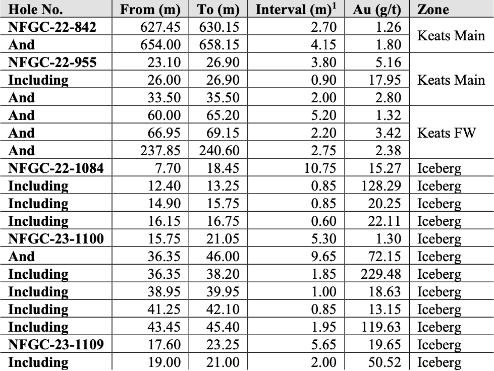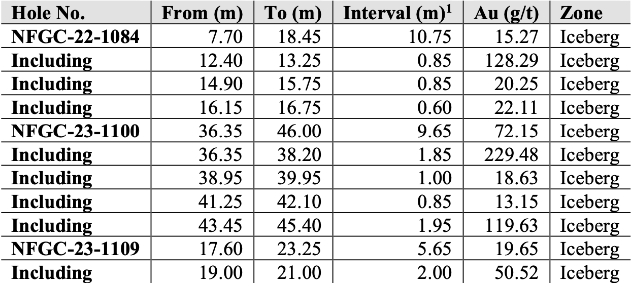- Today’s holes outline a new high-grade, at surface discovery named Iceberg that spans a strike length of 50m and remains open in all directions and to depth. Drilling collared into mineralization in NFGC-22-1084 with 15.3 g/t Au over 10.75m, while a 25m step-out south intersected 72.2 g/t Au over 9.65m in NFGC-23-1100, and a 25m step-out north intersected 19.7 g/t Au over 5.65m in NFGC-23-1109. All three intercepts are shallow, occurring at depths of less than 30m from surface (Figures 1-4).